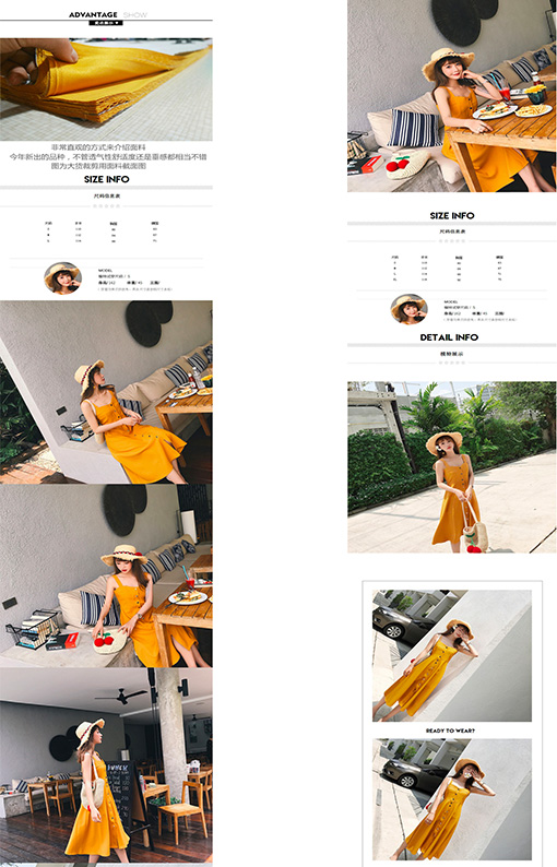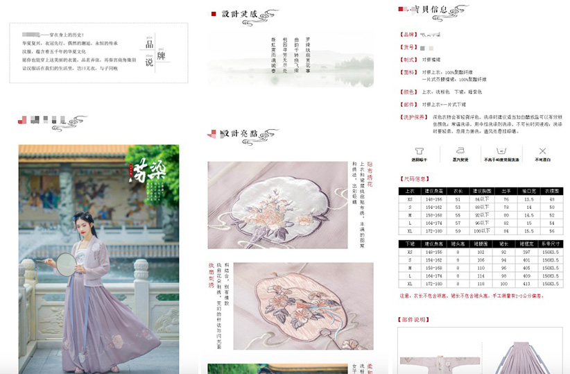 目前網(wǎng)上售賣的服裝風格非常多,有韓版、日系、歐美風、復古風、網(wǎng)紅風、文藝小清新等。每種風格對應的詳情頁設計風格是完全不一樣的,有針對性的設計能提高商品轉(zhuǎn)化率。比如漢服女裝一般在前三屏設計除了海報、尺碼表、商品屬性外會放品牌故事和設計靈感的文案,達到情感營銷的目的。